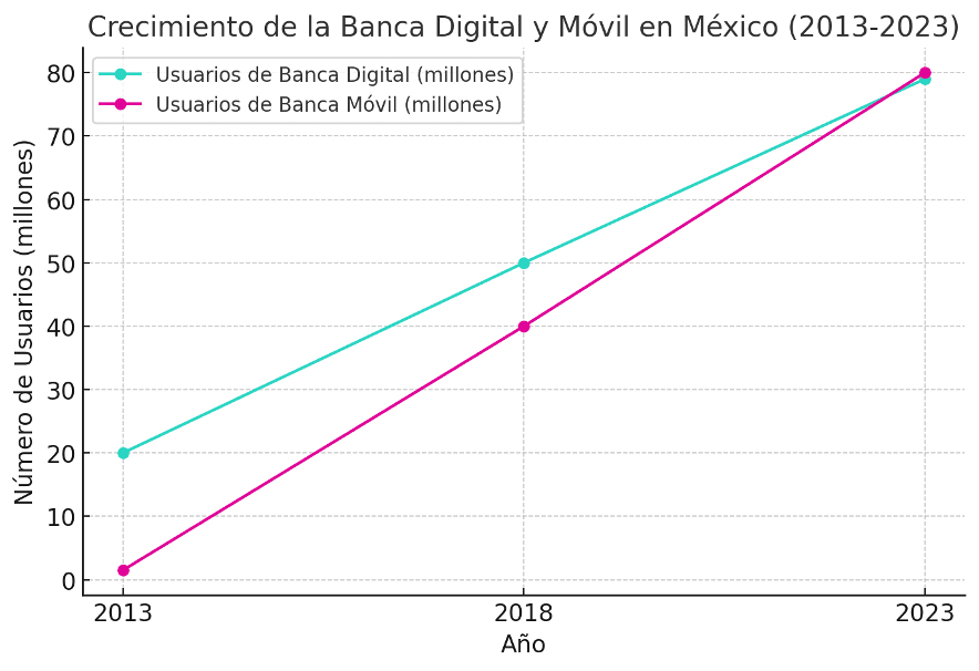 El avance de la digitalización en la banca mexicana ha sido notable en la última década. En 2023, el número de usuarios de banca digital en México alcanzó los 79 millones de personas, representando un crecimiento del 294% respecto a 2013. Por su parte, la banca móvil pasó de 1.5 millones de usuarios en 2013 a 80 millones en 2023, consolidándose como el canal de mayor crecimiento.
