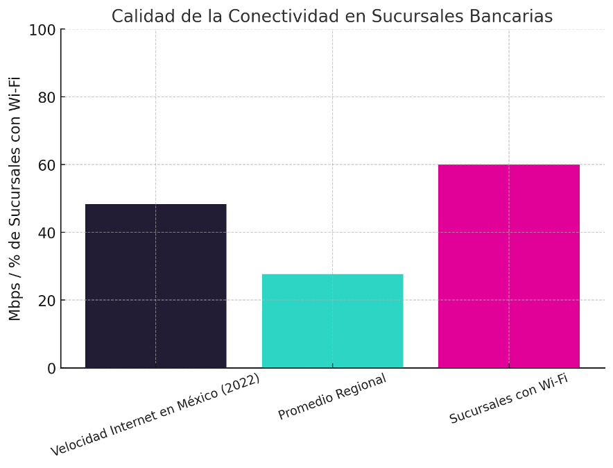La conectividad dentro de las sucursales bancarias sigue siendo un reto en términos de calidad y disponibilidad. En México, la velocidad promedio de internet en 2022 fue de 48.3 Mbps, lo que representa un incremento del 380% desde 2015.